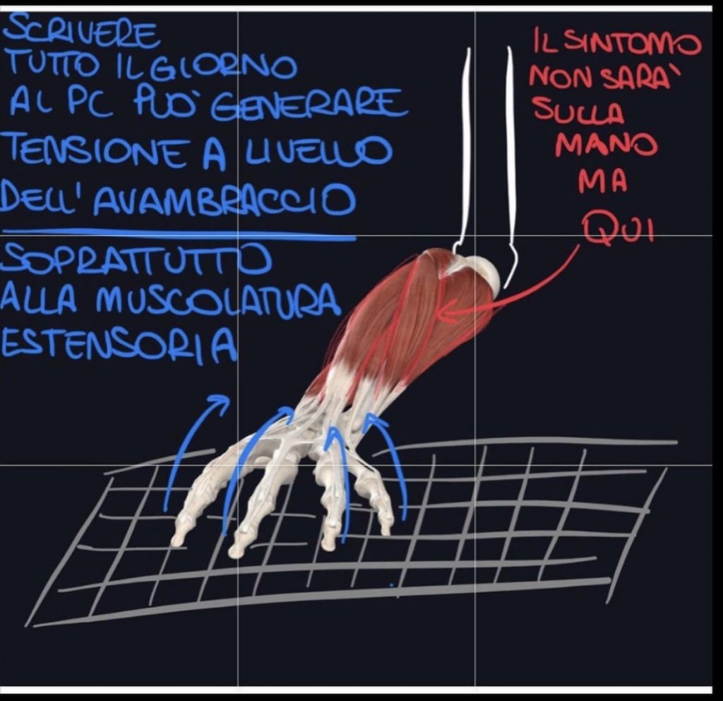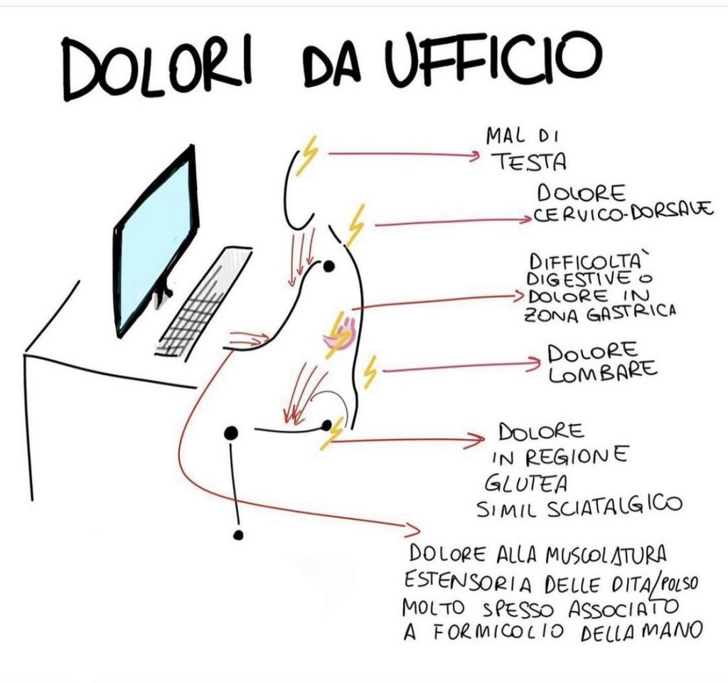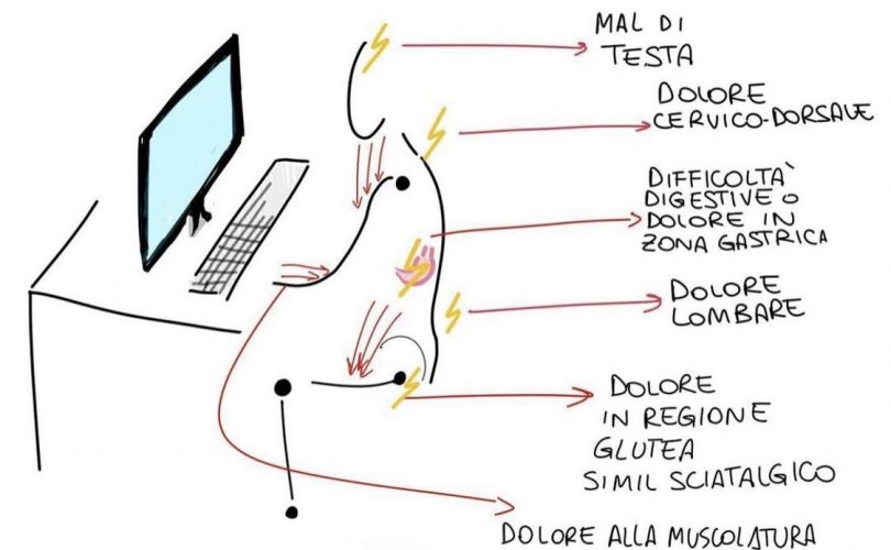 Nella postura da scrivania, quindi da smart working, avremo un atteggiamento in chiusura, di accorciamento dei muscoli, aumento della cifosi dorsale, con allungamento dei fasci muscolari cervico-dorsali, accorciamento dei flessori d’anca, compressione della componente sciatica a livello del gluteo e accorciamento della muscolatura estensoria dell’avambraccio.